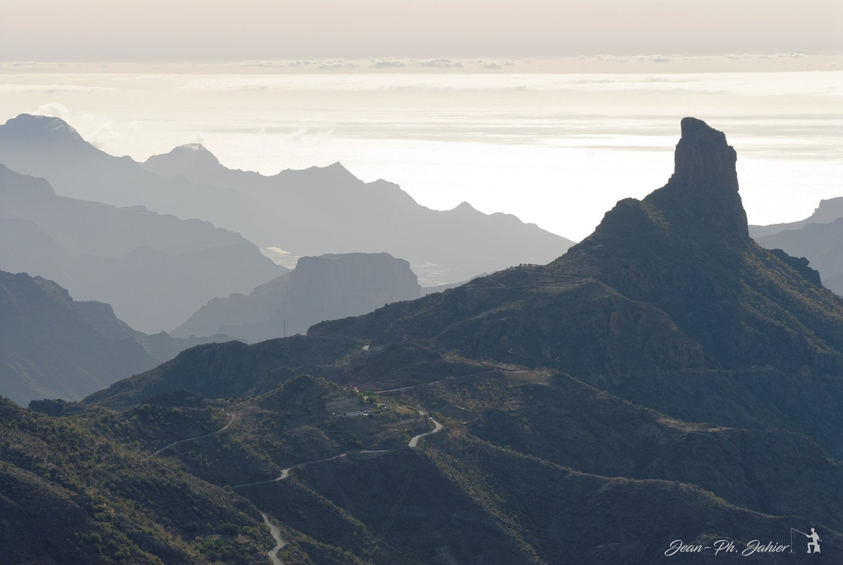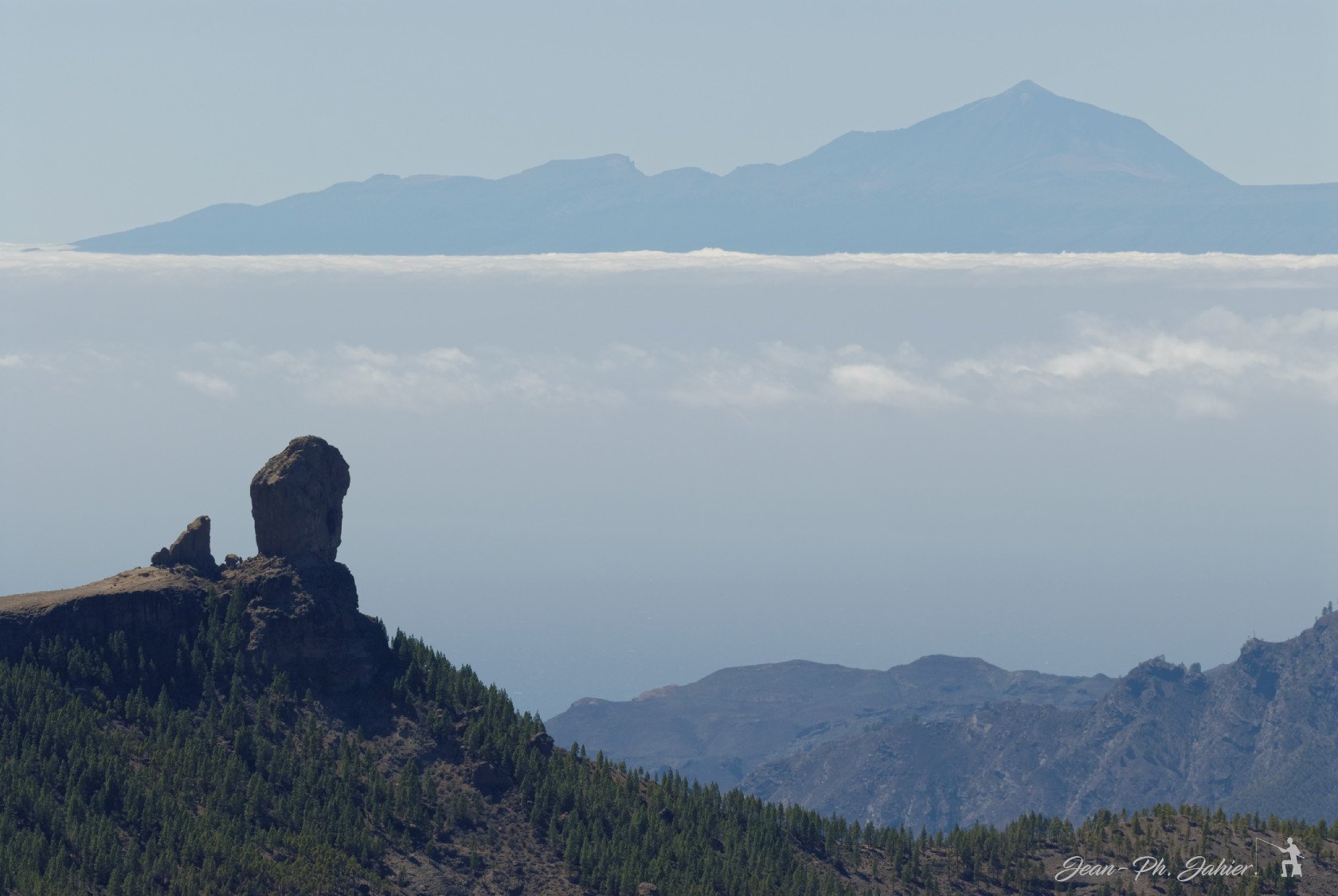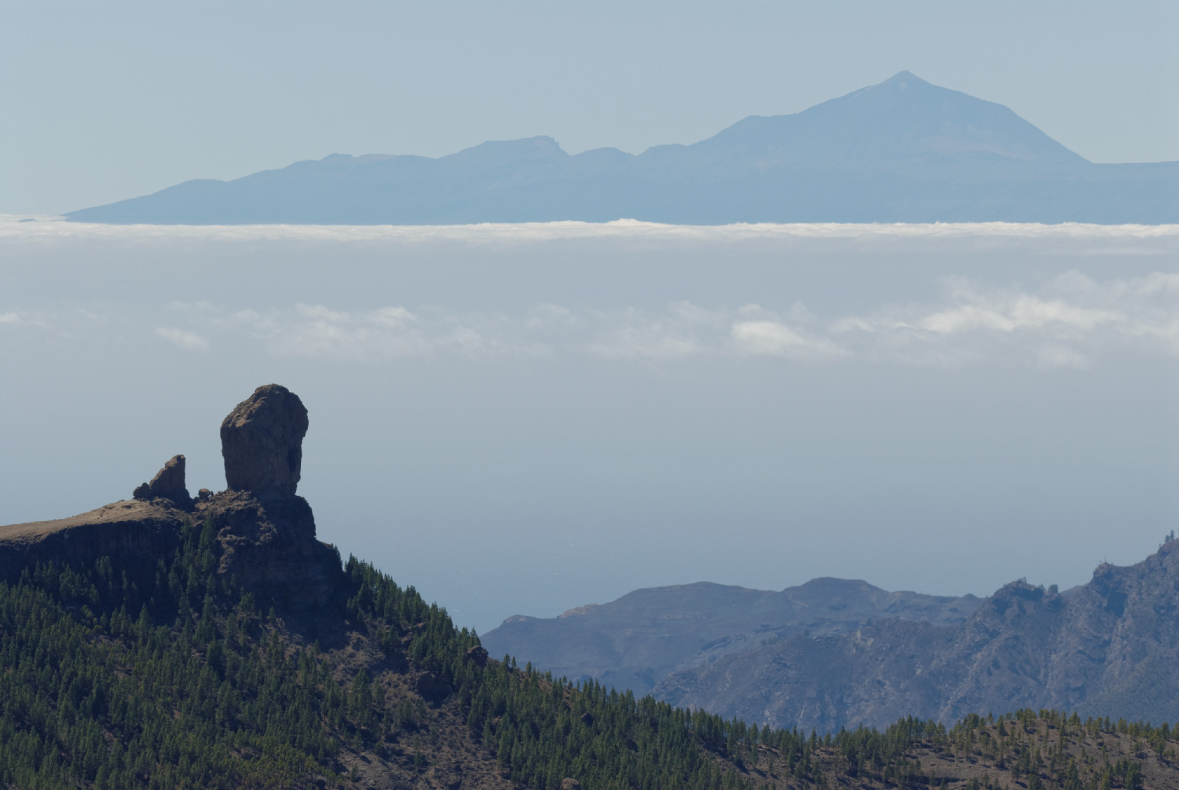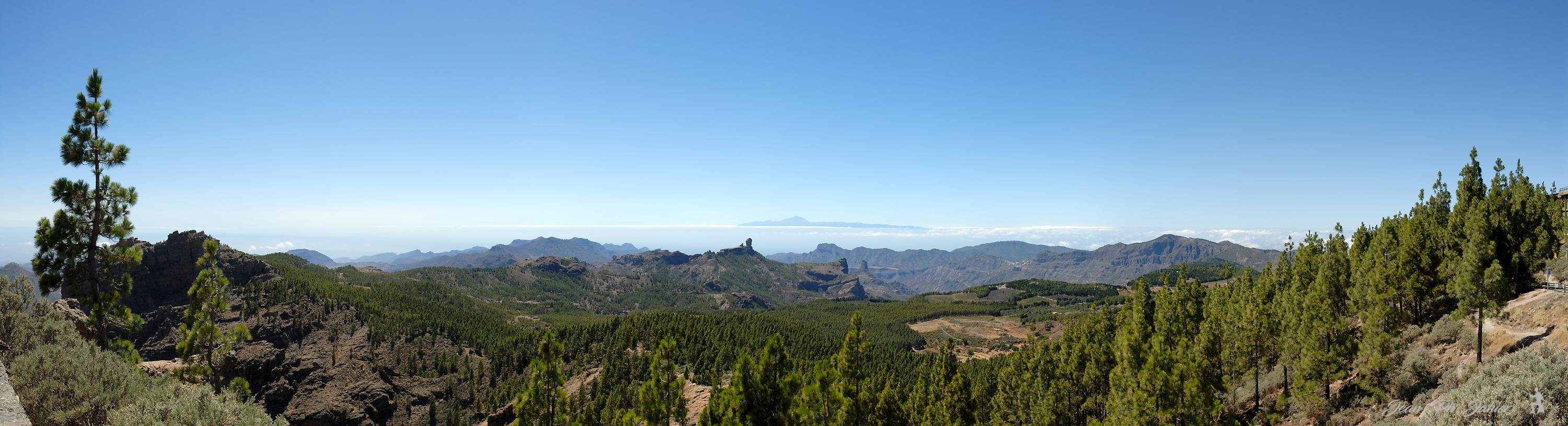 A la grande canarie, un panorama pris du Pico de las Nieves; à plus de 100km à l'ouest le Teide culmine à 3700m au dessus de Tenerife