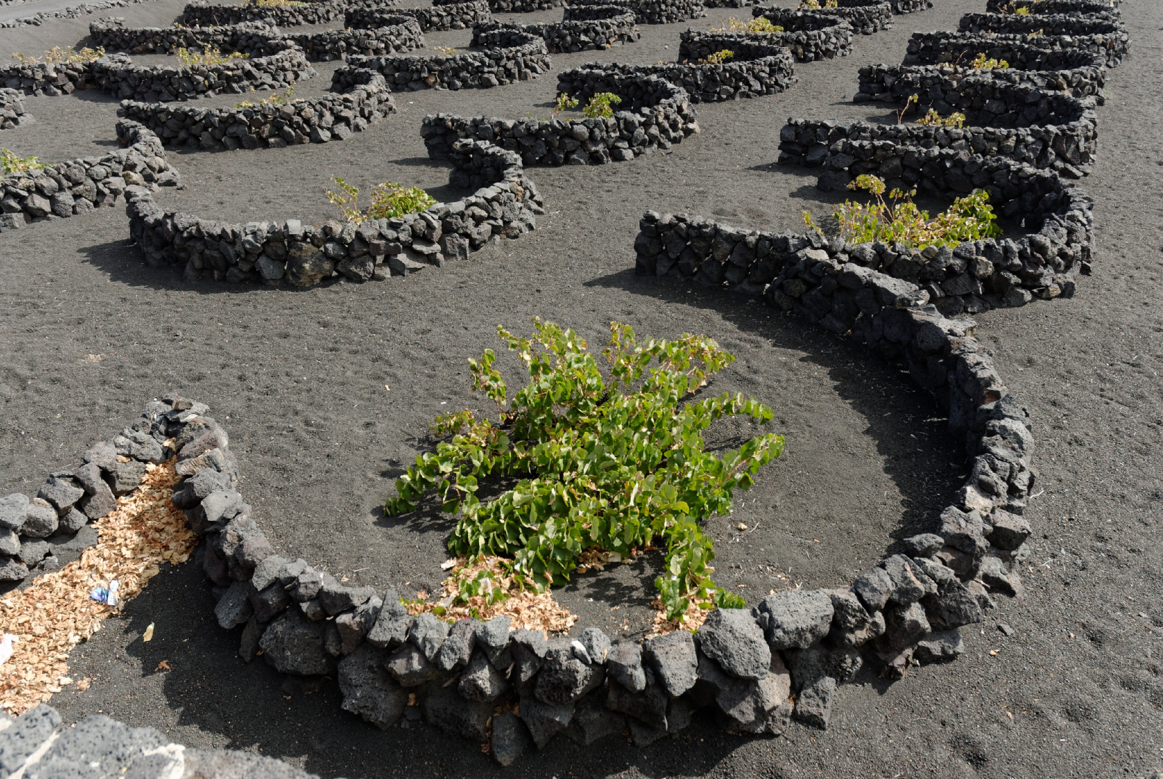 technique de culture de la vigne, protégée des vents secs permanents par de petits murets de pierres seches